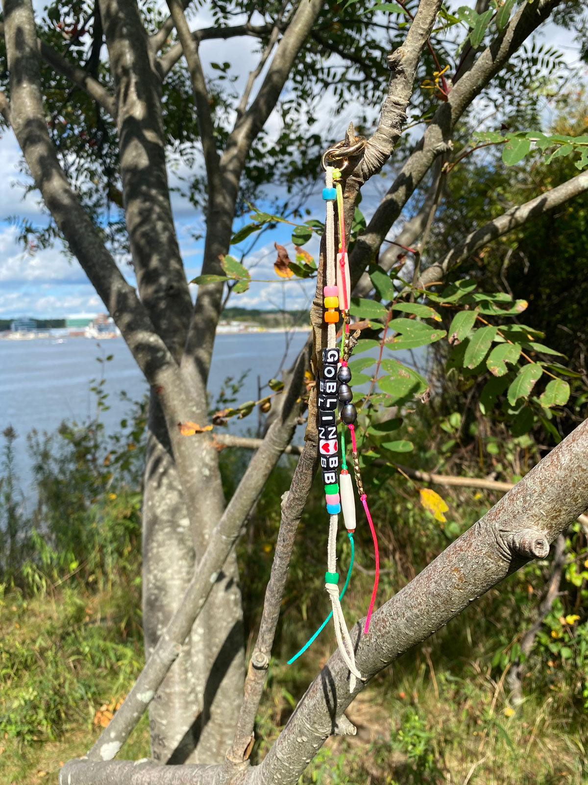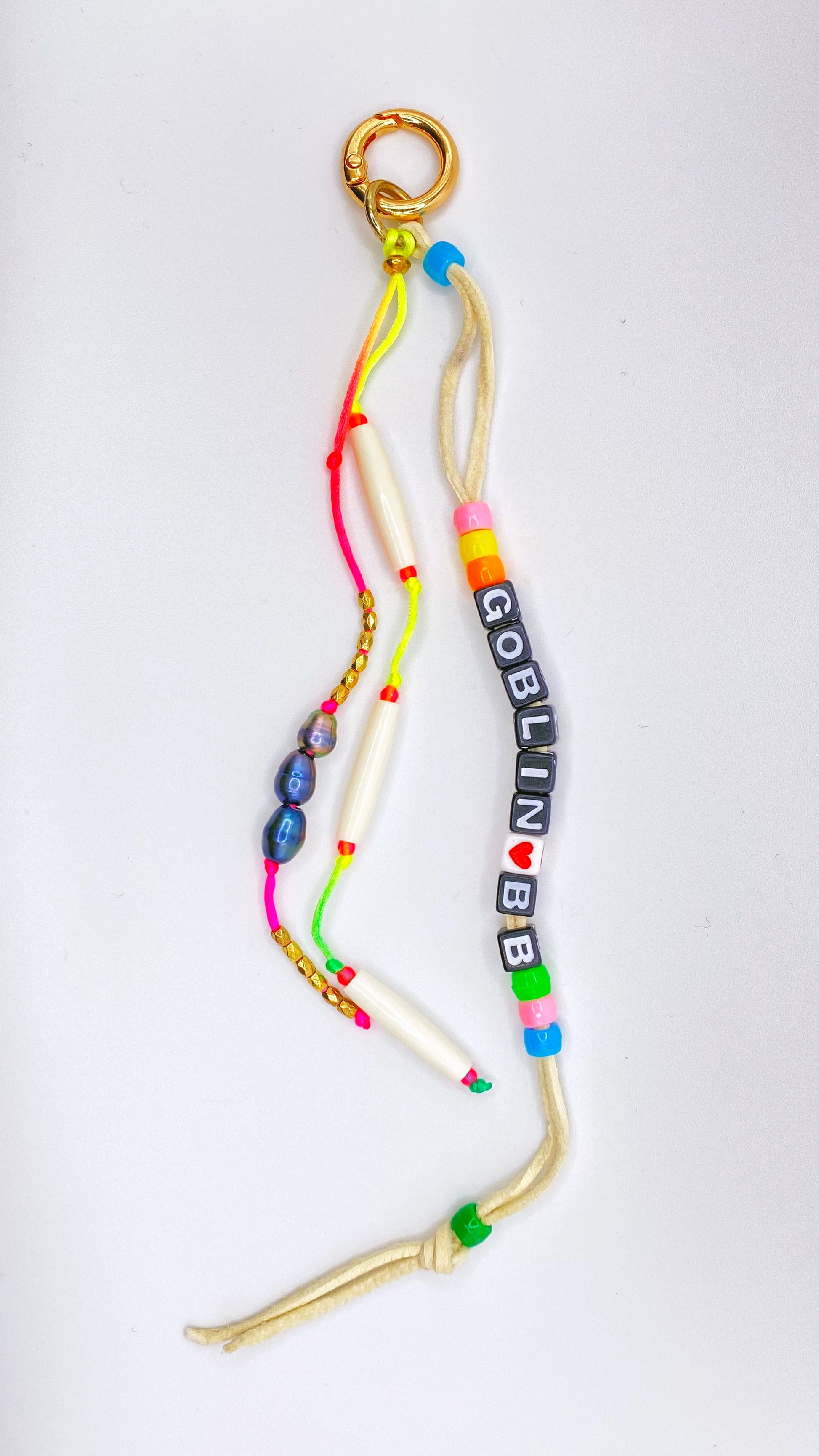 Nostalgic camp charm made with classic pony beads and letter beads on white deerskin leather lace, with rainbow strands of bone hairpipes, metal beads and freshwater pearls.
