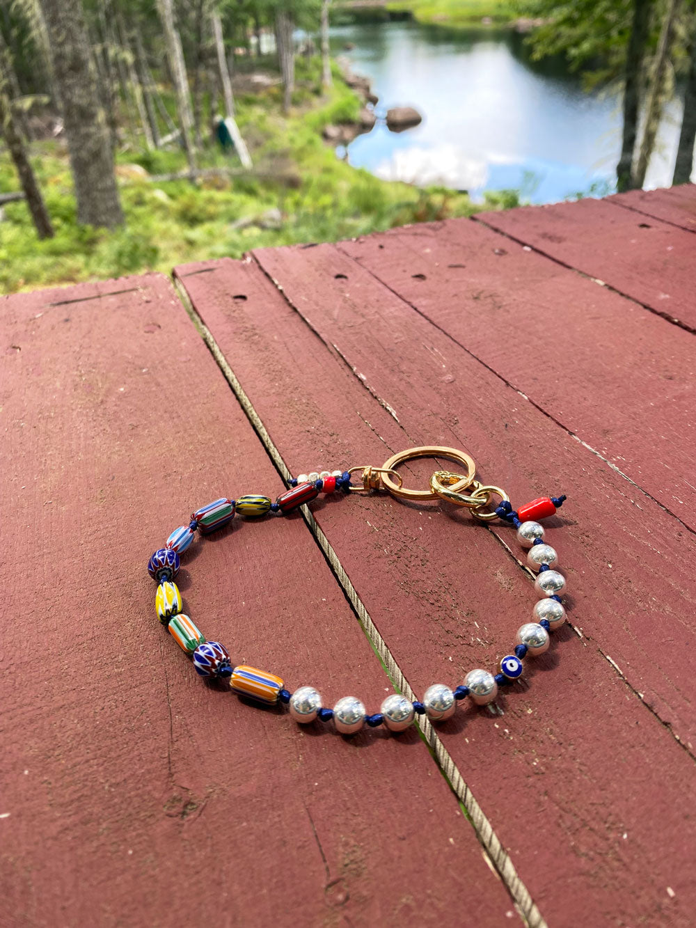 Tactile keychain made with millefiori glass beads and silver metal balls with antique glass beads, on colourful cord. Attachment is made of small gold carabiners and keychain ring.