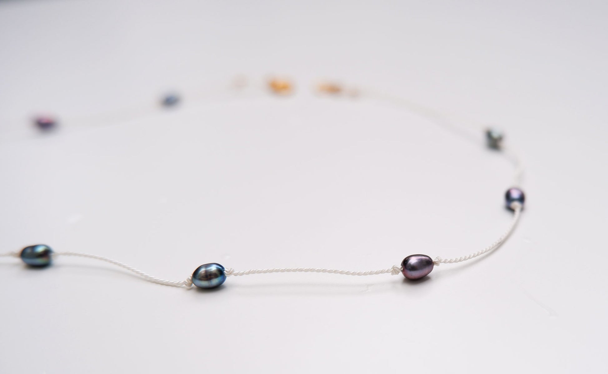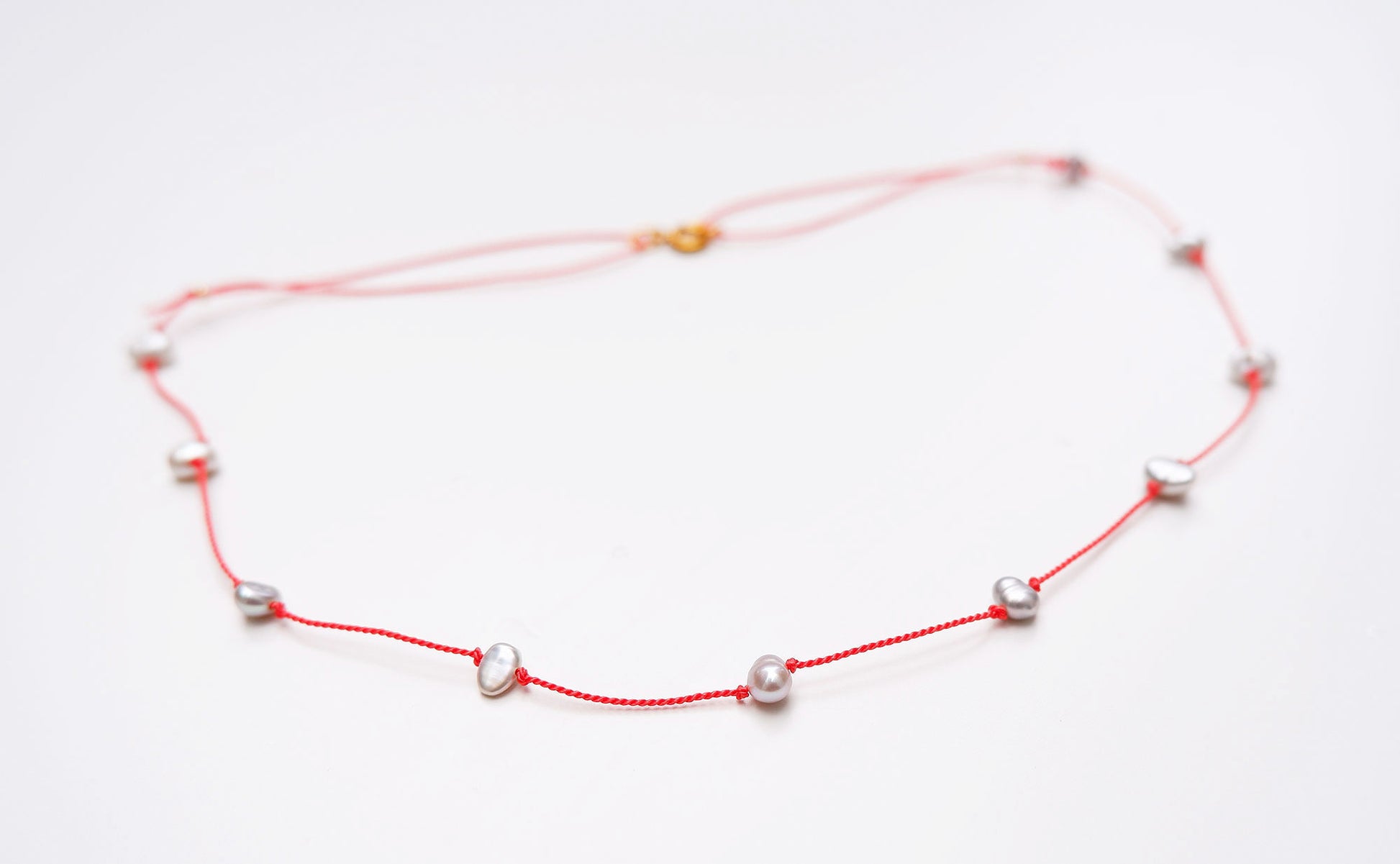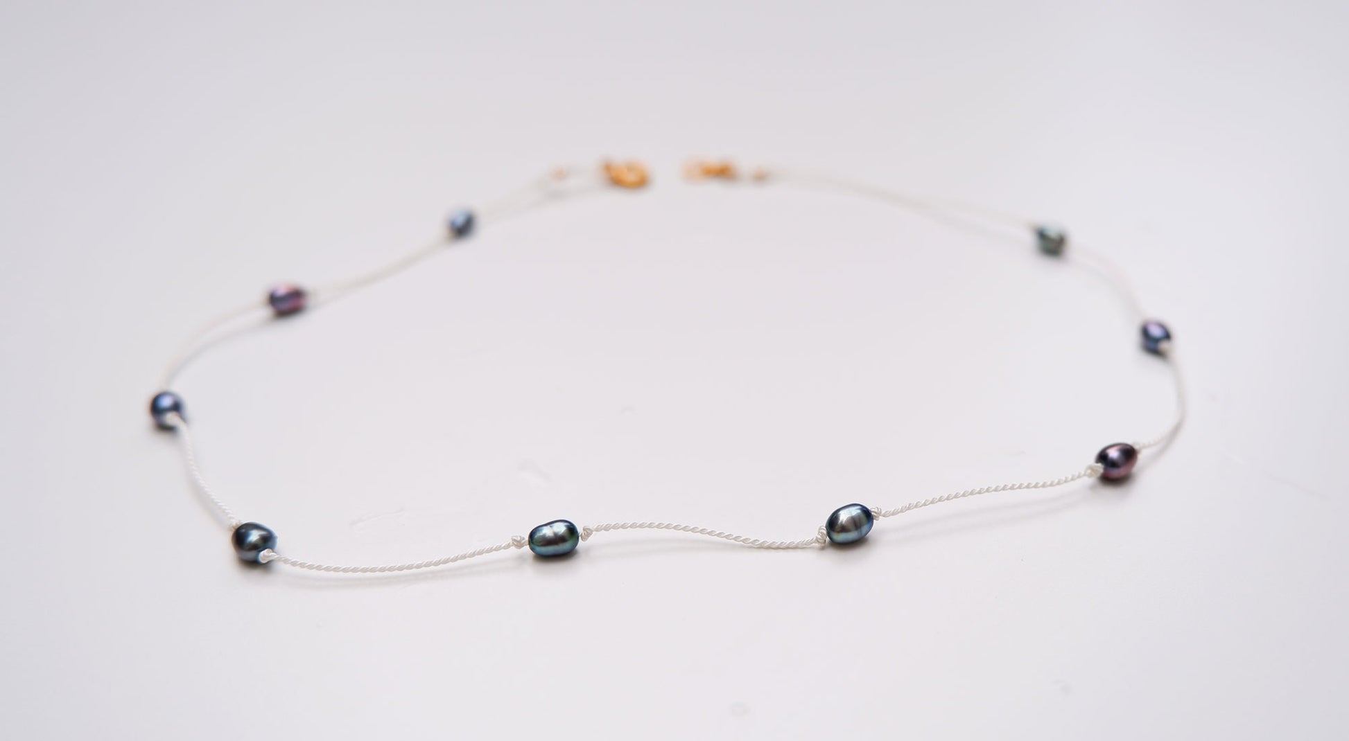 Tiny, irregular white freshwater pearls, separated by simple knots, strung on 100% silk cord with an adjustable length and gold-plated findings. Handmade.