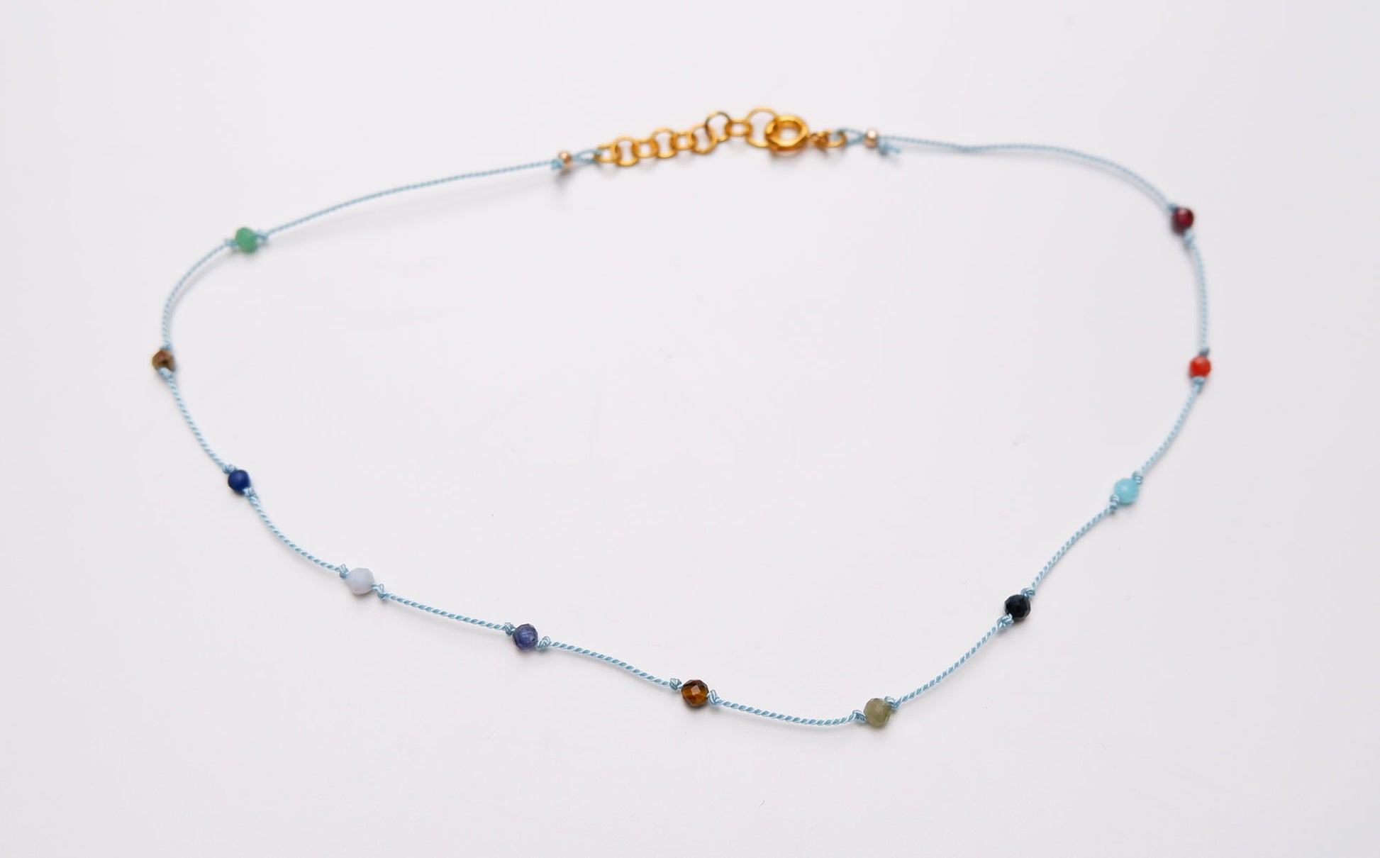 Delicate little necklace made with a rainbow of natural gemstones, including amethyst, tigerseye, garnet, apatite, aventurine and others. Strung on 100% silk cord with an adjustable length and gold-plated findings. Handmade.
