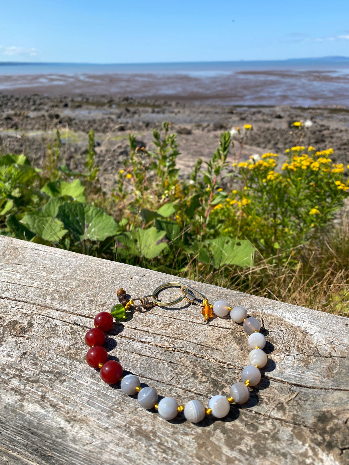 Very tactile keychain made from white agate and carnelian stones on a gold cord, finished with antique glass beads. Attachment is a small gold carabiner with a keychain ring. Handmade.